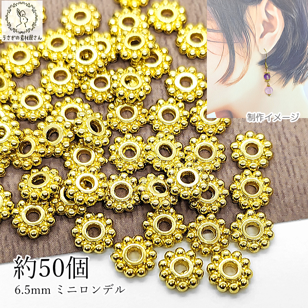 メタルビーズ ロンデル 小さめ 6.5mm幅 約50個 ゴールド色 花状 歯車 ギア スペーサー 特価 合金ビーズ アンティーク調 ハンドメイドパーツ うさぎの素材屋さん