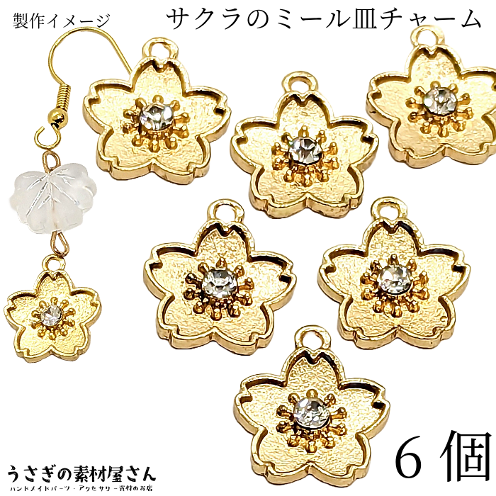 桜 チャーム さくら ミール皿チャーム 14mm 6個 ゴールド色 クリア ストーンチャーム サクラ フラワー レジン枠 パーツ ガラスストーン付き 春