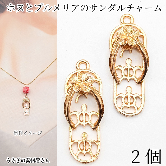 チャーム ビーチサンダル ホヌ プルメリア 約29mm 2個 ゴールド色 透かしチャーム ハワイアン マリン 海 夏のハンドメイドパーツ アクセサリーパーツ