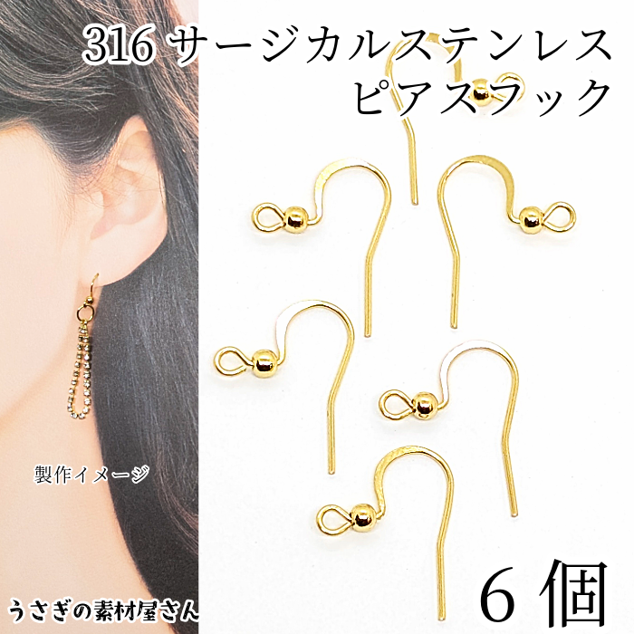 ピアスパーツ 316 サージカルステンレス フックピアス 15mm 6個 ゴールド色 シンプル フィッシュフック 18KGP本金メッキ ステンレス製ピアス 金具パーツ