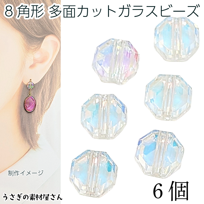 ガラスビーズ 平 八角形 8mm 6個 多面カット クリア オーロラ系 ファセットカットビーズ 小さな サンキャッチャー 通し穴 アクセサリーパーツ