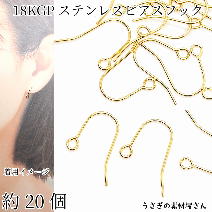 フックピアス ピアスパーツ ステンレス 18KGP本金メッキ 20mm 約20個 ゴールド色 フィッシュフックピアス ステンレス製ピアス ハンドメイドパーツ
