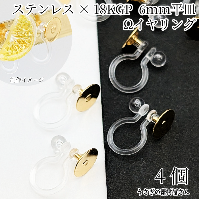 クリップイヤリング ステンレス 18KGP 本金メッキ 6mm平皿 4個 ノンホール オメガタイプ イヤリング パーツ アクセサリーパーツ うさぎの素材屋さん