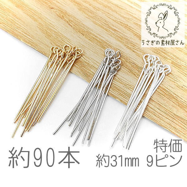 9ピン 約31mm ハンドメイド 基礎金具 アイピン ニッケルフリー 特価 約90本/ゴールド色/ロジウム色/シルバー色