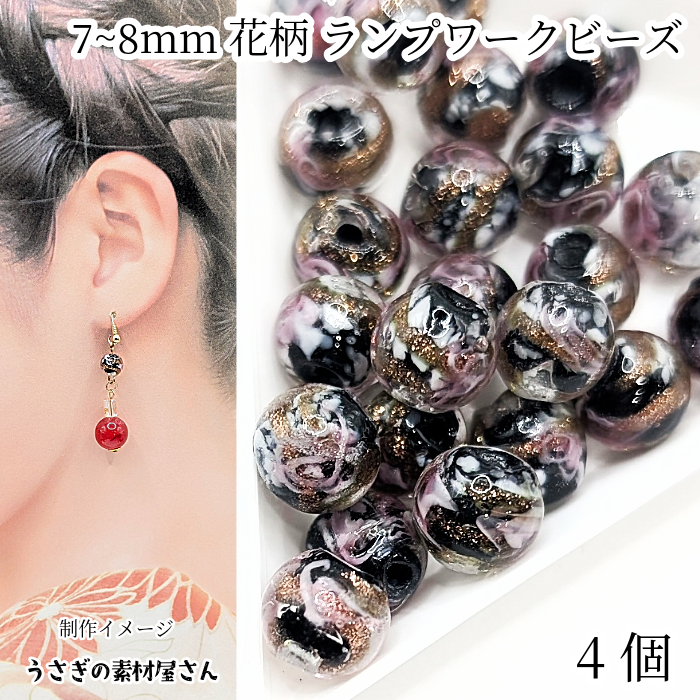 ガラスビーズ 花柄 ランプワークビーズ 約7mm〜8mm ブラック系 黒色 4個 ゴールドサンド入り アクセサリーパーツ ハンドメイドパーツ うさぎの素材屋さん