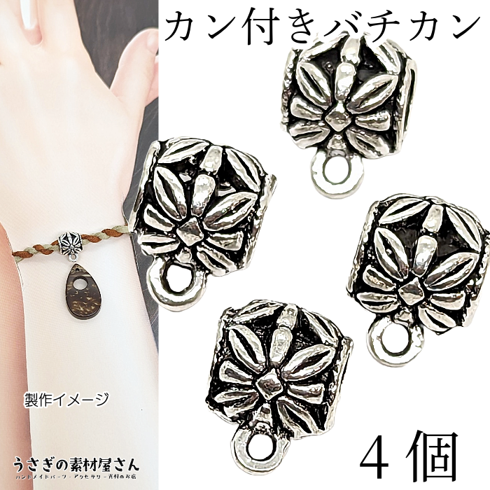 バチカン 大穴 ロンデル 通し穴 約5mm 4個 カン付き フラワー アンティーク調 シルバー色 ヘアゴム製作にも バレル アクセサリーパーツ うさぎの素材屋さん