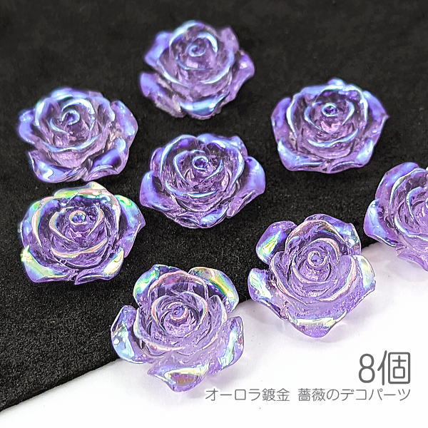 貼り付け 薔薇 約15mm クリア樹脂 カボション デコ ローズ オーロラ鍍金 バラ 8個/ラベンダー