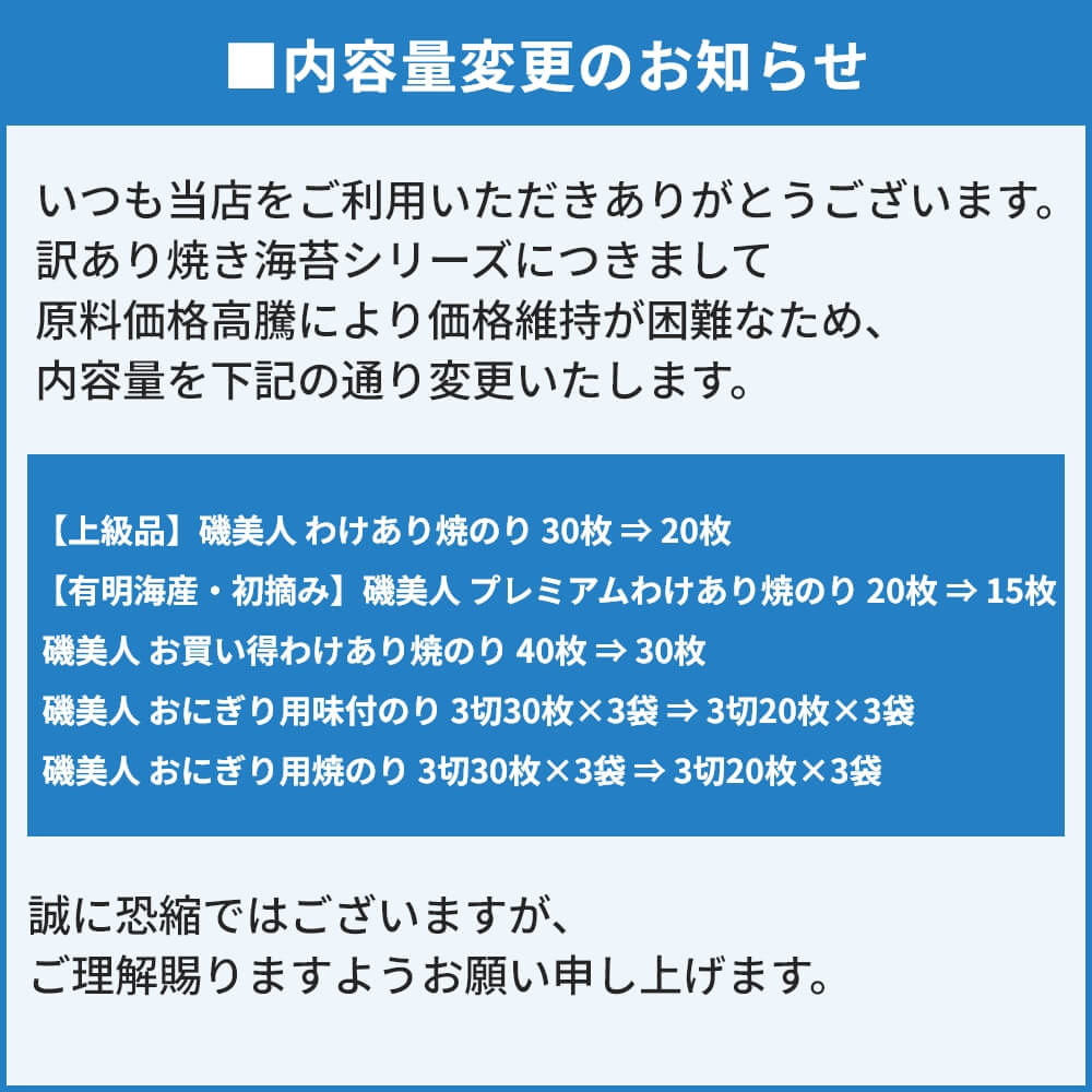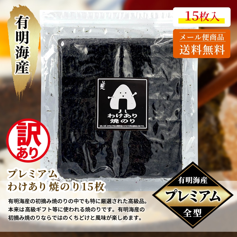 【有明海産・初摘み】磯美人 プレミアムわけあり焼のり 15枚 有明海産の初摘み焼のりの中でも特に厳選された高級品で、本来は、高級ギフト等に使われる焼のりなのですが、製造過程でわれ、ひび、かけ等が出来てしまった為に規格外品になってしまった極上の焼のりです。