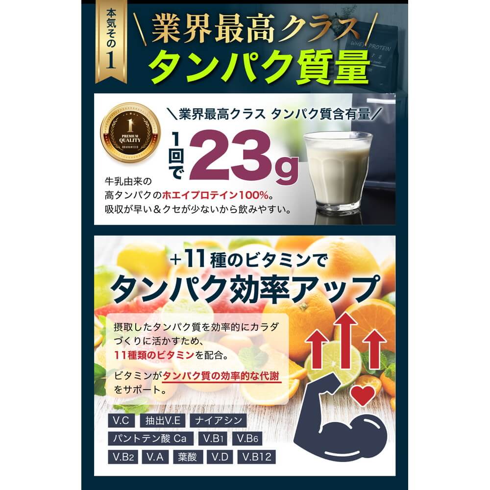 乳清たんぱく(アメリカ製造)、食塩、デキストリン、乳酸菌(殺菌)/クエン酸、乳化剤、香料、甘味料(スクラロース)、V.C、抽出V.E、ナイアシン、パントテン酸Ca、V.B1、V.B6、V.B2、V.A、葉酸、V.D、V.B12(一部に乳成分・大豆を含む)