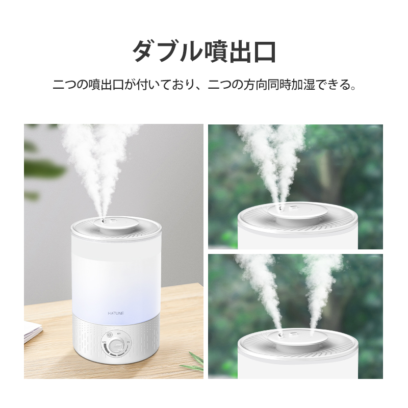 9 ダブル噴出口:二つの噴出口が付いており、二つの方向同時加湿できる。