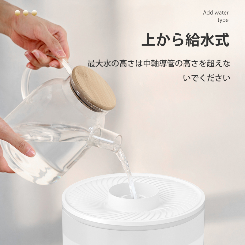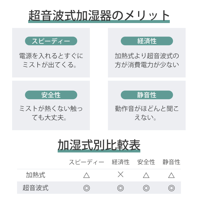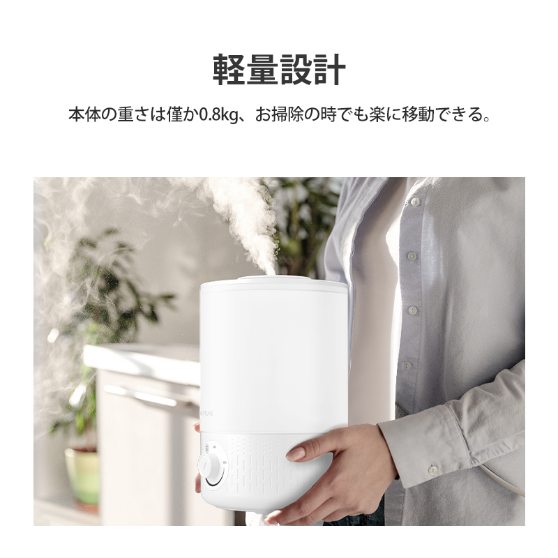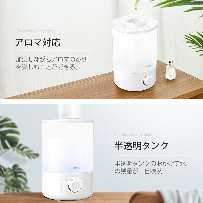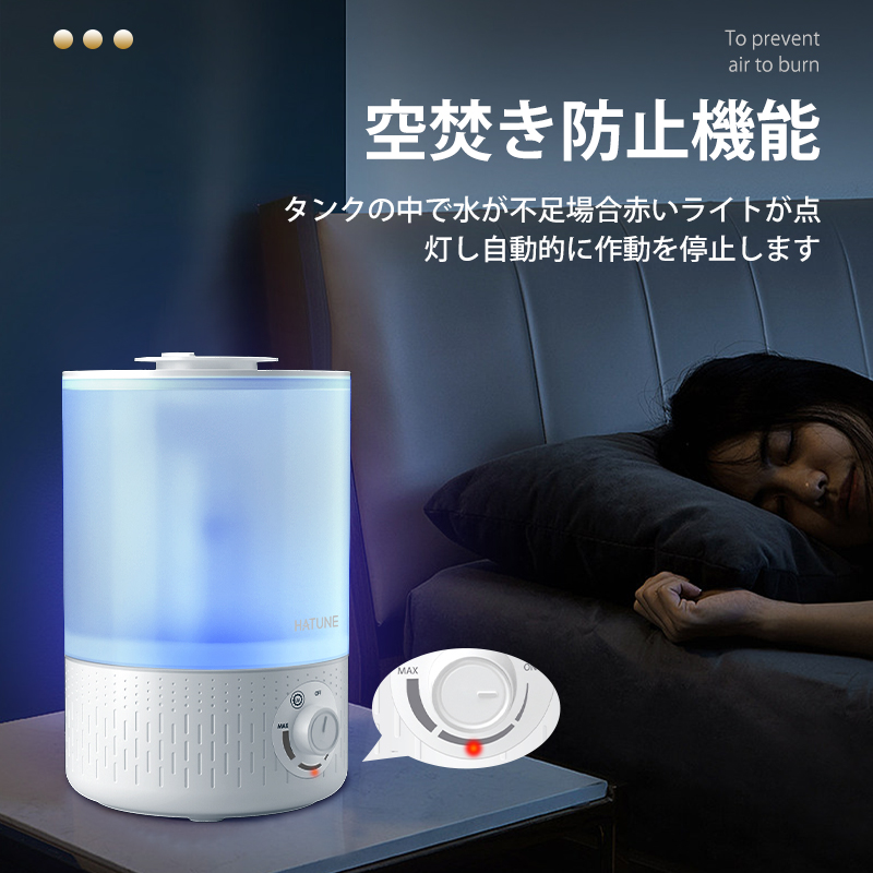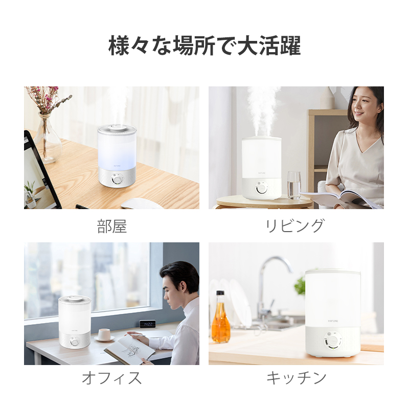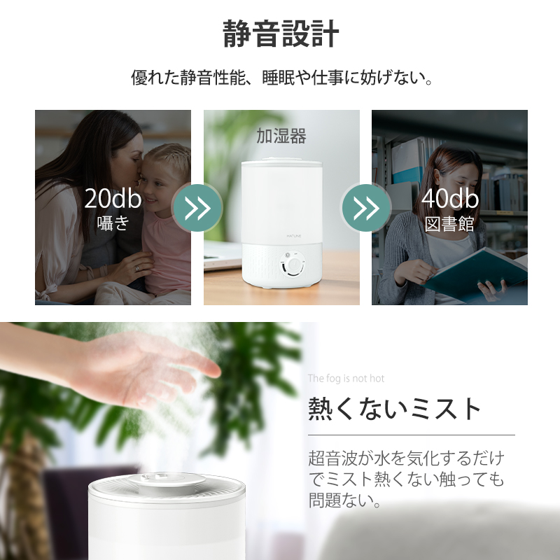 4 超微細ミスト:自然蒸発しやすい超微細ミストで、加湿器の周囲が濡れにくい。
