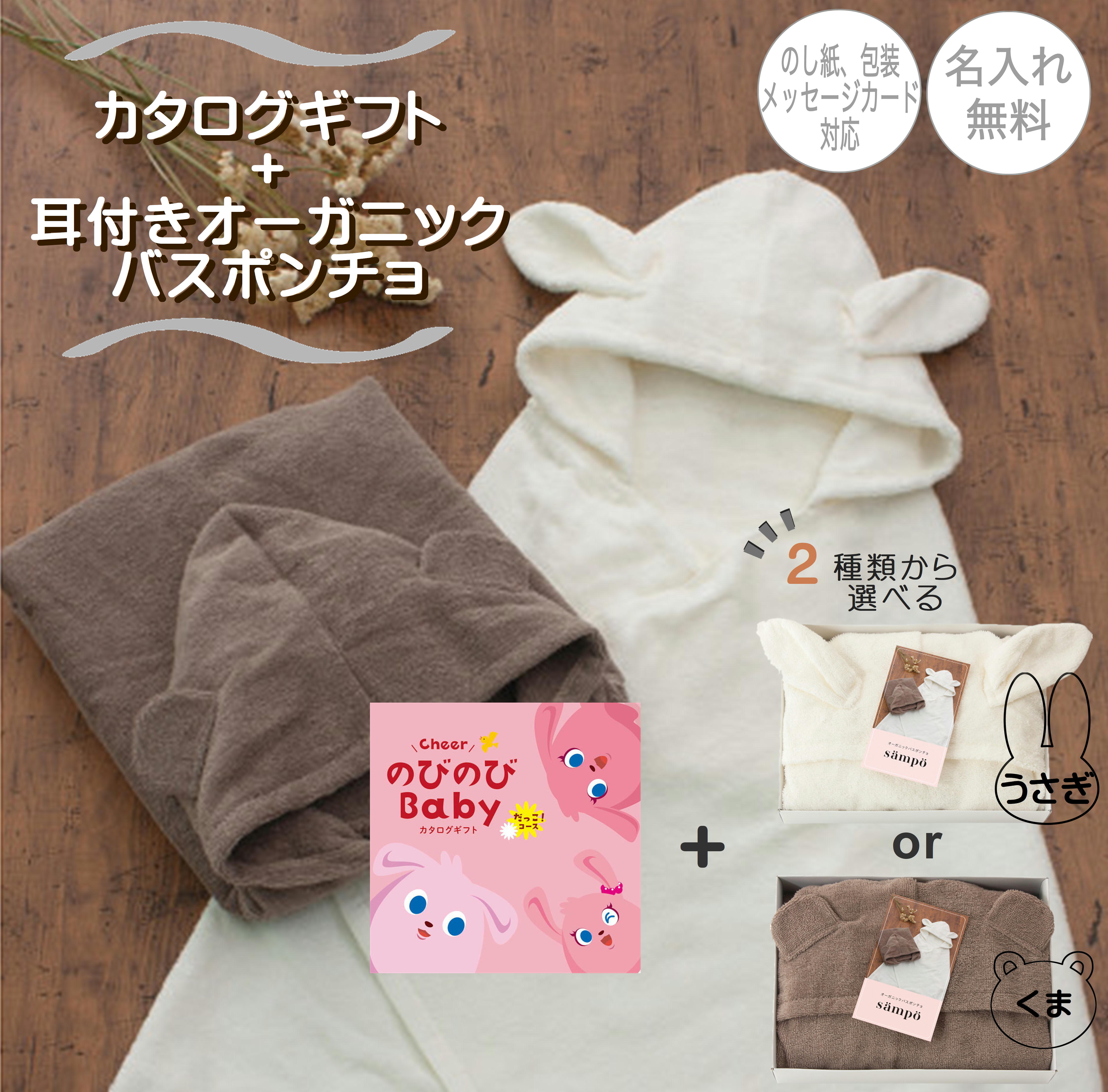 選べるカタログギフト「のびのびBaby・だっこコース」とオーガニックコットン100%のやさしい心地のキュートな耳付きバスポンチョのセットです。