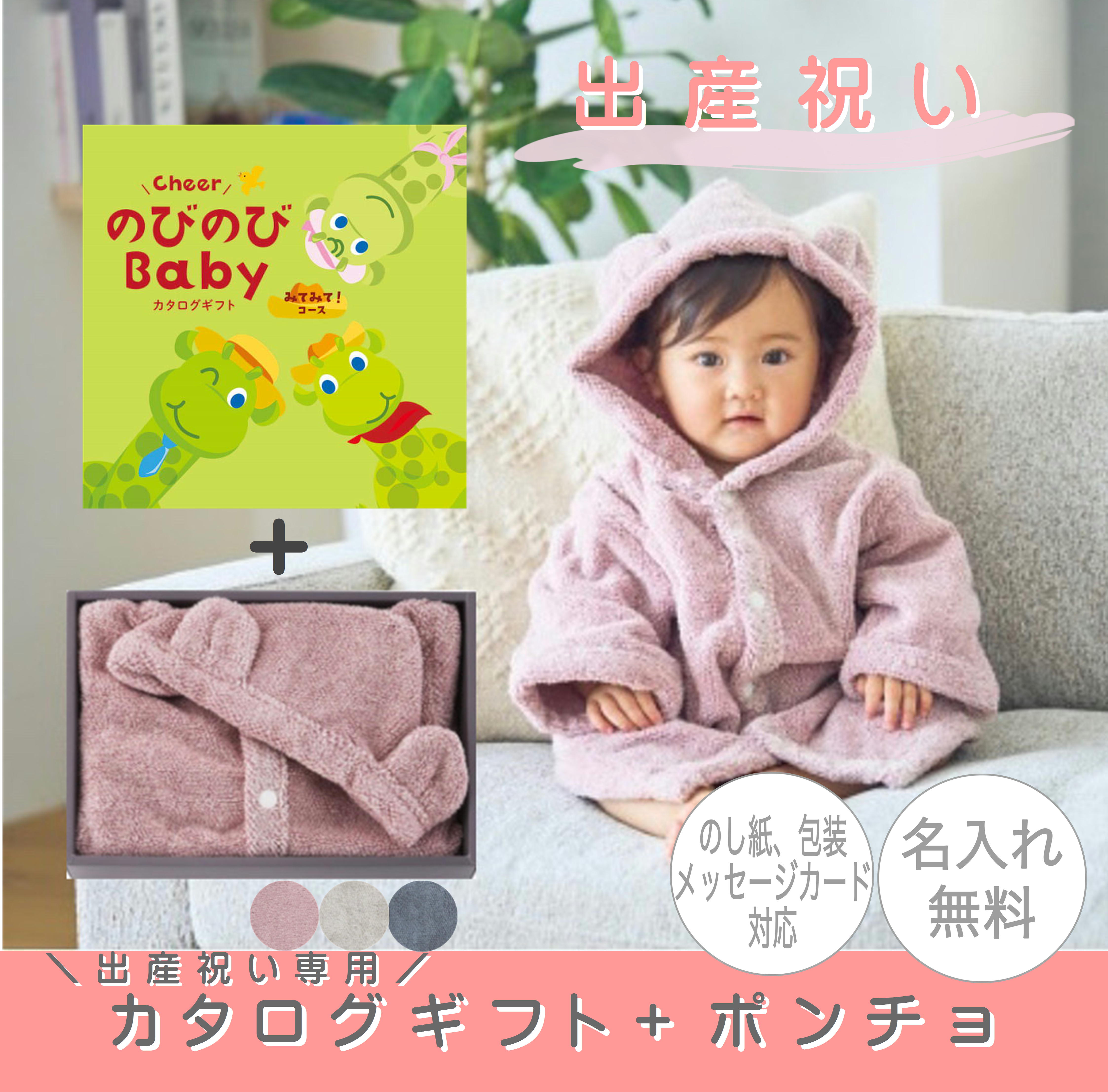 選べるカタログギフト「のびのびBaby・みてみてコース」と何度洗ってもパイルがへたりにくく、パイルが立った形状を持続させる製造技術で作られた「ポンチョ」のセットです。