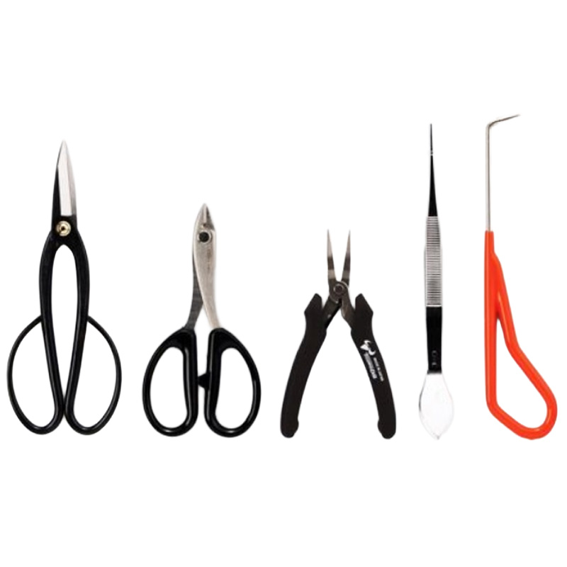 セット内容:道人印足長盆栽鋏(1074)、ステンレスワイヤーカッター(2308)、ステンレス先細リードペンチ(3401)、ヘラ付ピンセット(1318)、ステンレス小品盆栽用根かき(2345)