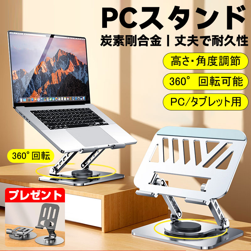 安定性と高性能のノートPCスタンド、360°回転でき、高さや角度は調整可能です、炭素剛を防錆加工し、強度と硬度はアルミ合金より優れており、耐摩耗性、高強度、耐久性、錆びにくい等の特性をを持っており、折りたたみ可、iPad等のタブレットにもご使用いただけます。