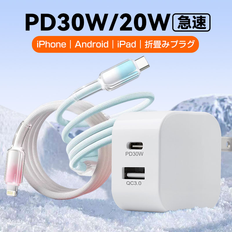 iPhone 17 16e PD 30W 充電器 Type-C タイプ C 急速 AC アダプター Android iPad USB-A QC3.0 アンドロイド 携帯 スマホ ケーブル セット 折り畳み 電源