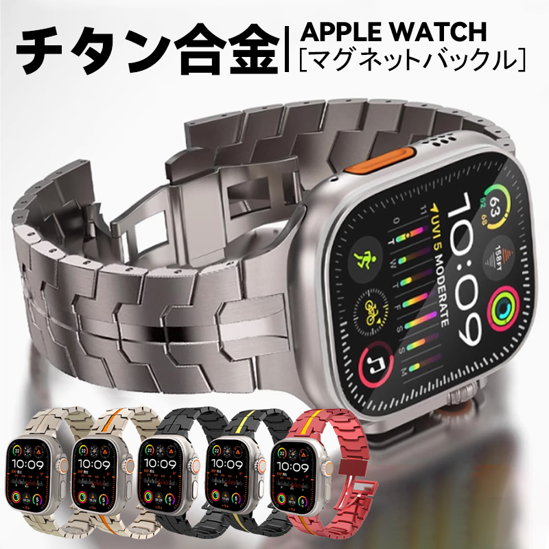 超硬質メッキ加工を施した、傷が付きにくい「チタン製」アップルウォッチバンド、最新のマグネットバックルで着脱簡単、AppleWatch全シリーズ(全サイズ)対応、6カラーよりお選びいただけます。