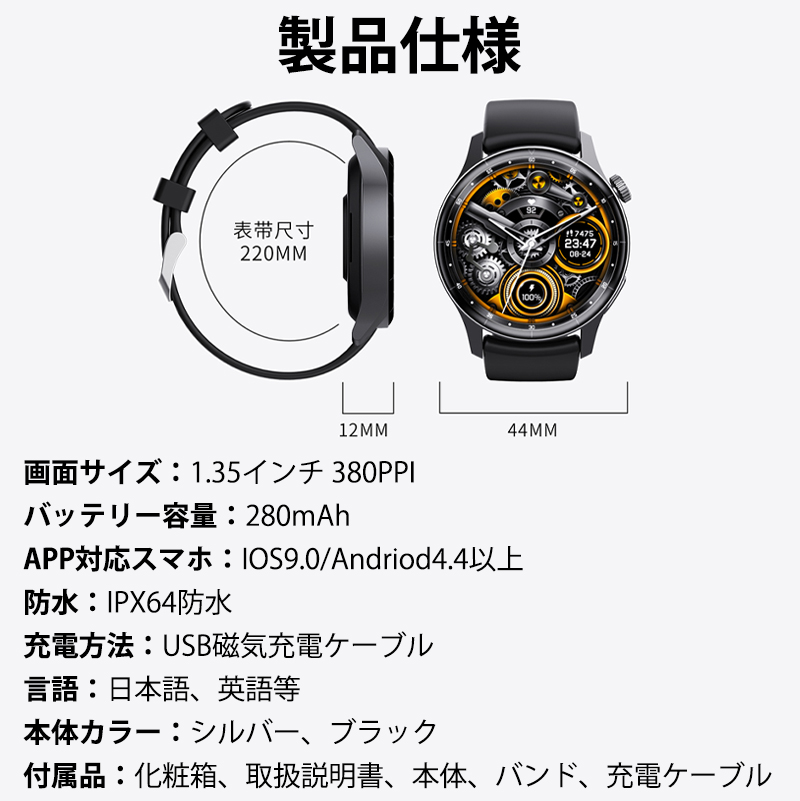 ・主要機能:Bluetooth通話、血圧、心拍数、血中酸素、体温、24時間睡眠モニターリング、100+文字盤、150+運動モード、多国言語(日本語)