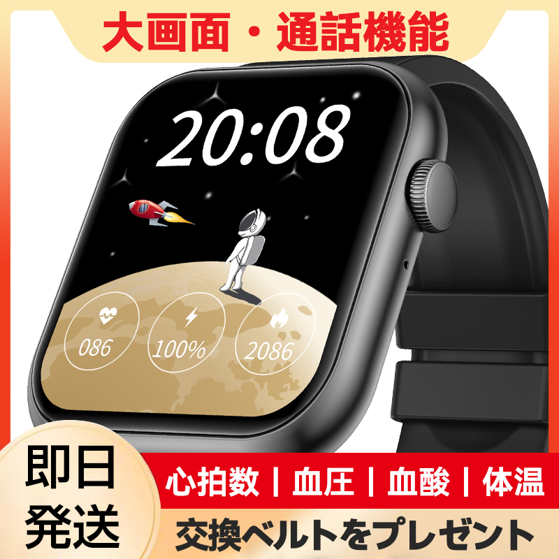 日本製センサーが搭載したスマートウォッチ、1.96インチ大画面、血圧、血中酸素、心拍数、体温などの健康管理機能が搭載、運動モード、睡眠モニタリング、Bluetooth通話機能、LINE通知機能、女性生理周期、LEDライト、天気予報などの機能が満載、