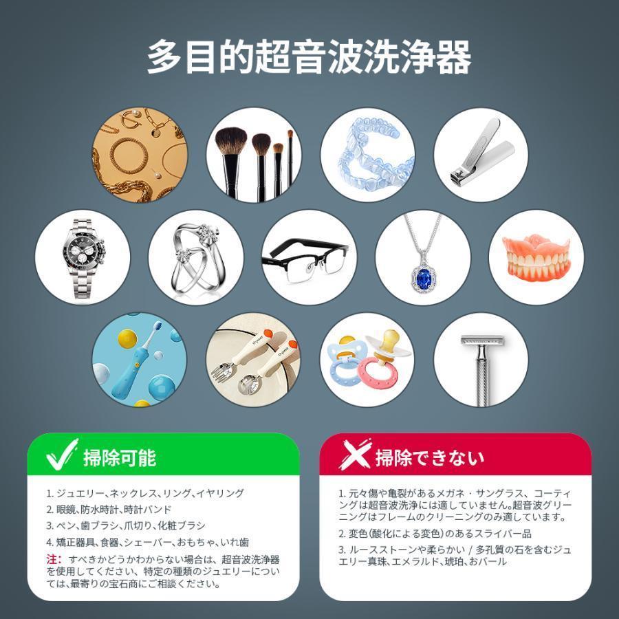 【洗浄できるもの】:プラスチック類、ガラス類、陶磁器類、貴金属(アクセサリー)例:メガネ、入れ歯、くしの他に、シェーバーの刃・化粧ブラシ・印鑑・ナイフ、フォーク・万年筆のペン先なども洗浄可能。