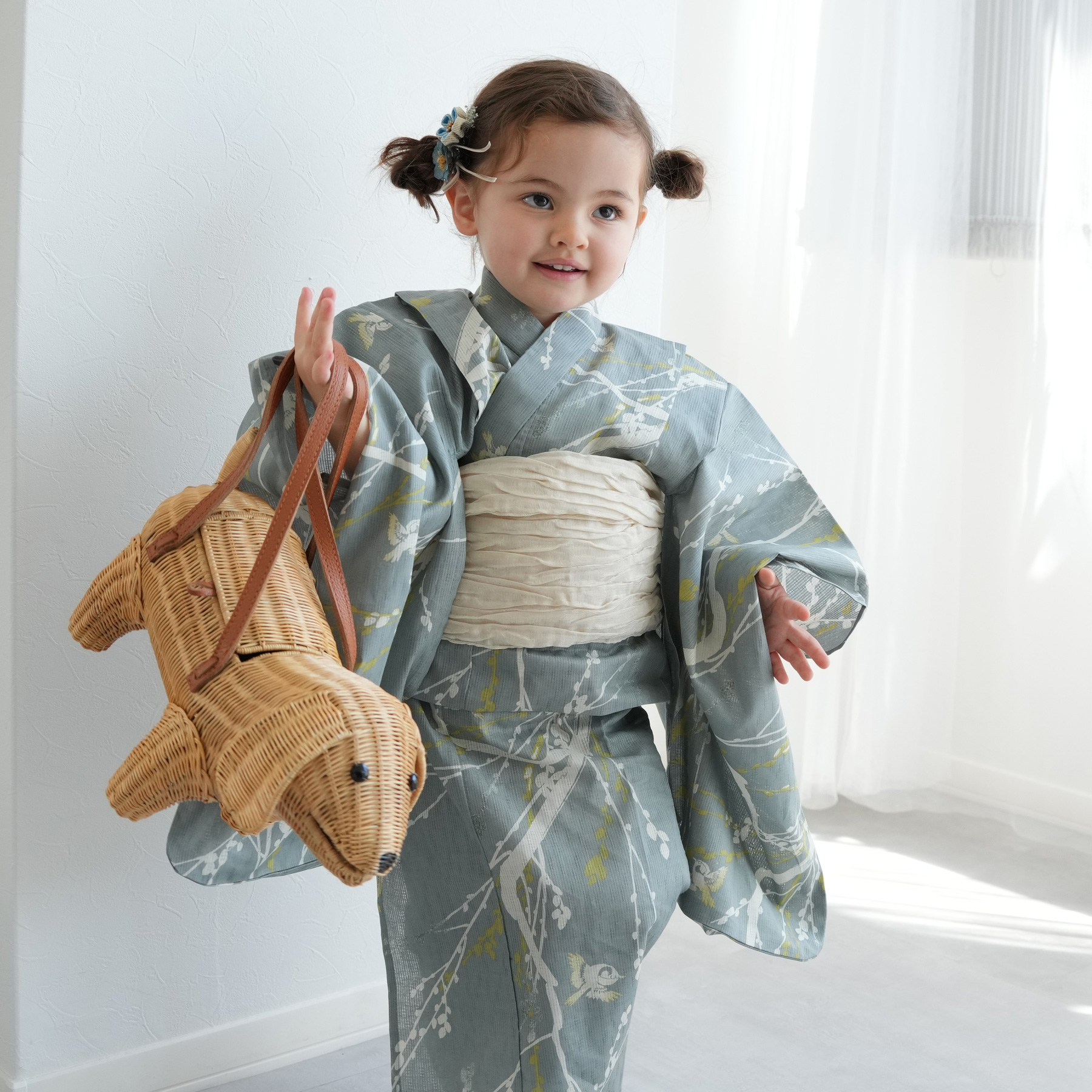 浴衣 子供 女の子 ひよこ商店 kids 高級変わり織 子供浴衣3点セット 女の子 浅葱鼠に飛び回る雀 こども浴衣セット ( ゆかた・帯・下駄 ) レトロ キッズ