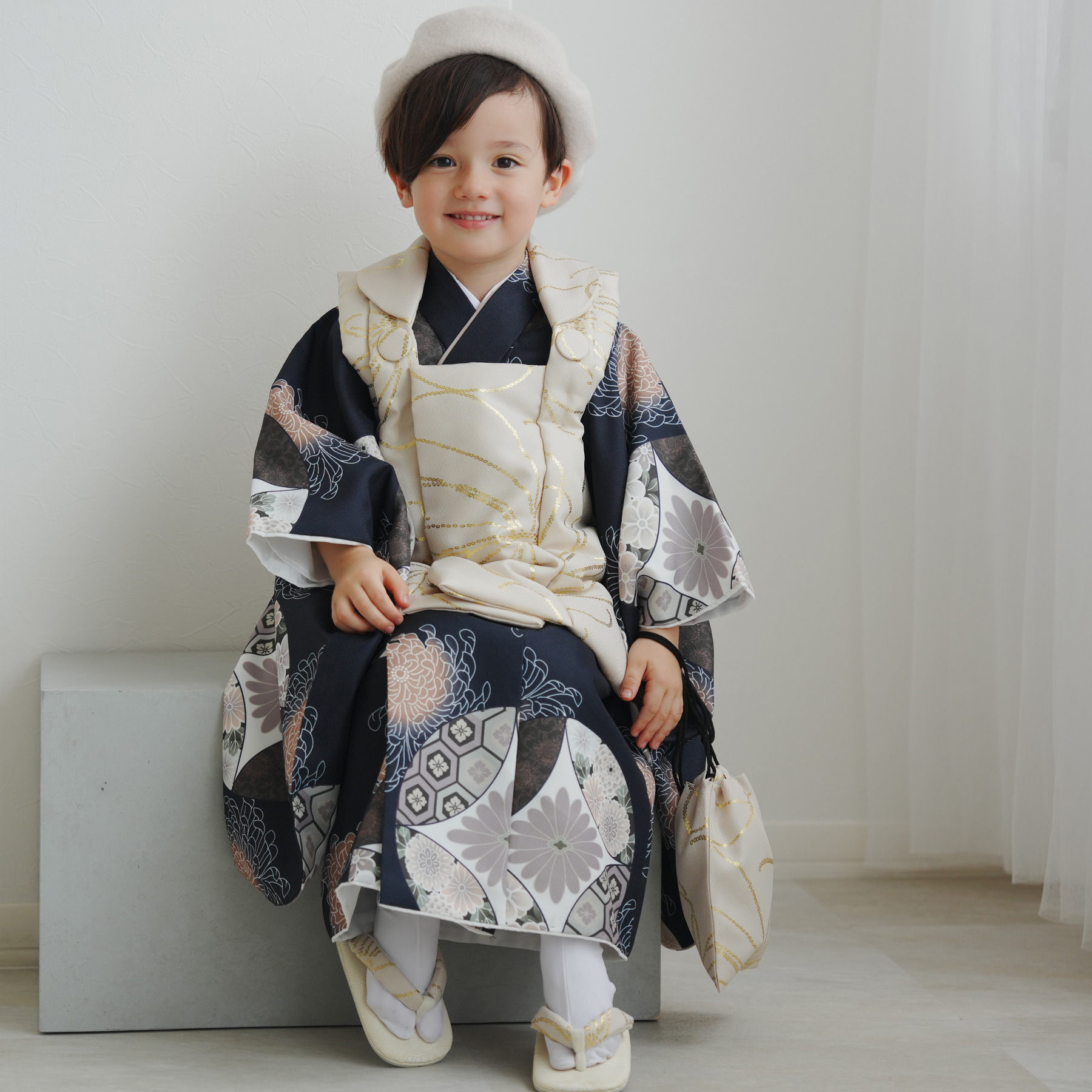 七五三 着物 3歳 男の子 被布 ひよこ商店 kids ベレー帽 被布フルセット ベージュ金彩×ネイビー七宝 レトロ 大正浪漫 3歳男子 子供 キッズ 販売 購入