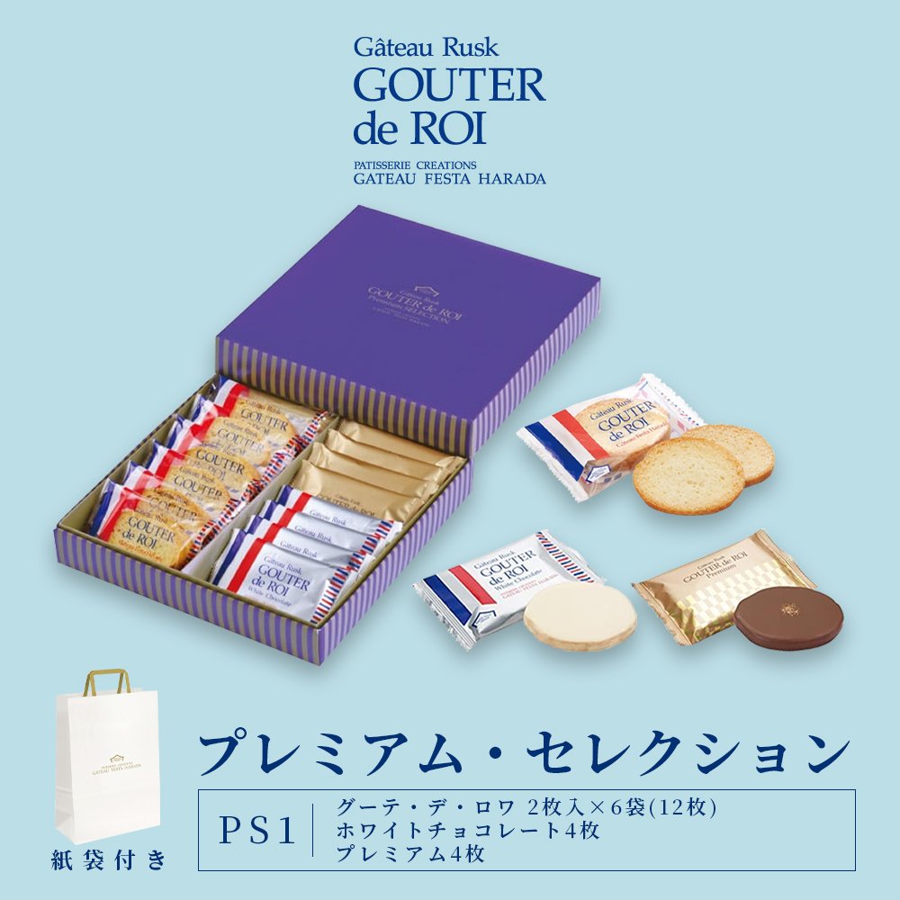 | 商品の説明 | 商品詳細 ○PS1 ・ガトーラスク グーテ デ ロワ 6袋12枚入り ・ホワイトチョコレート4枚 ・プレミアム4枚 ○サイズ タテ26×ヨコ26×高さ4.1(cm) ○特定原材料等 小麦、乳 ○賞味期間 : 50日(賞味期間は製造日からのものです。お届けの商品は、賞味期間半分以上有したものになります。) |