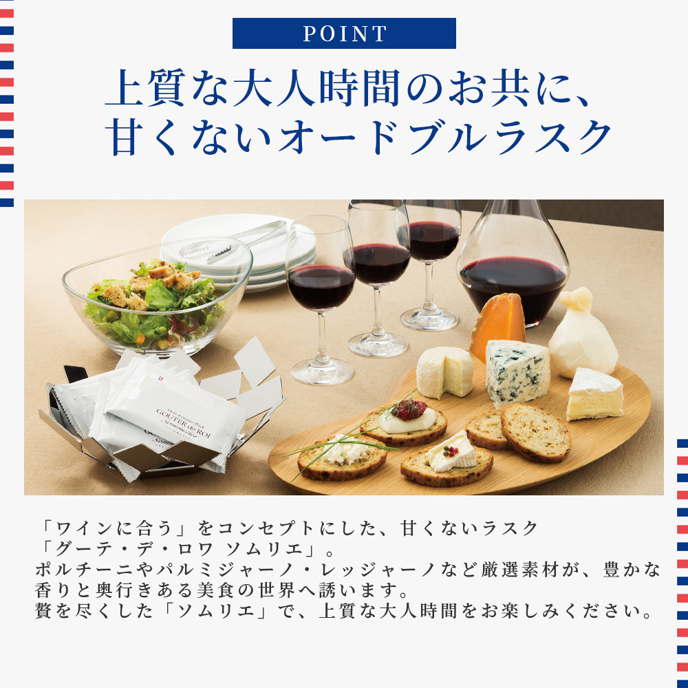 オードブルラスク「グーテ・デ・ロワ ソムリエ」は、厳選された食材、様々なスパイスを用いることにより、奥深いコクとうま味、香り、食材がかもしだす甘味のハーモニーをお楽しみいただけます。