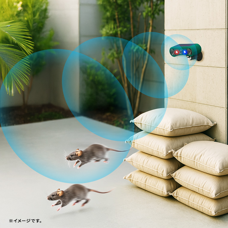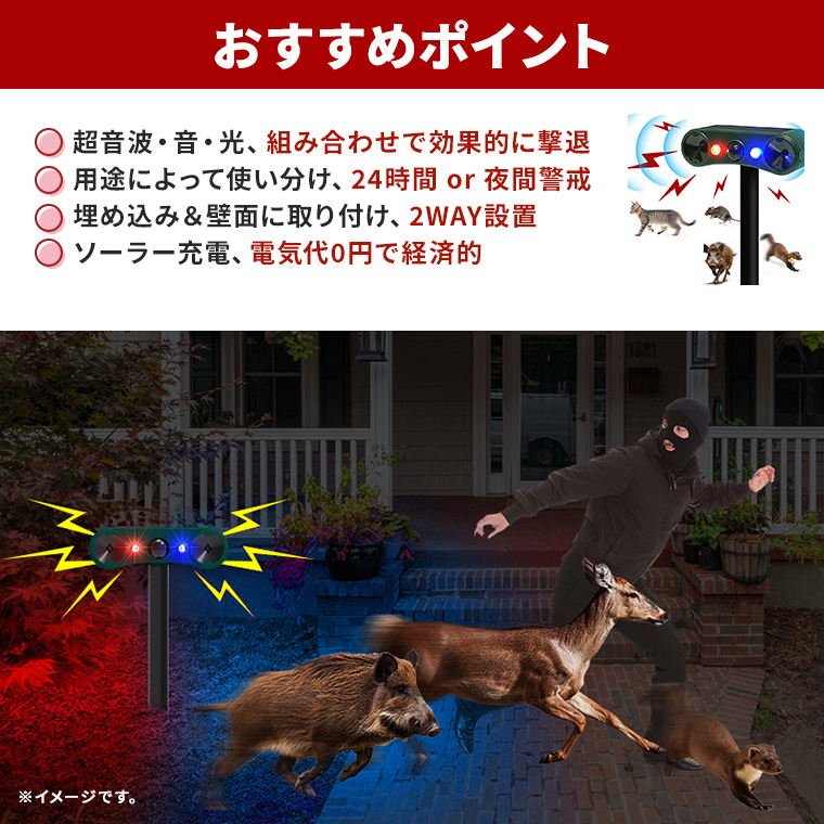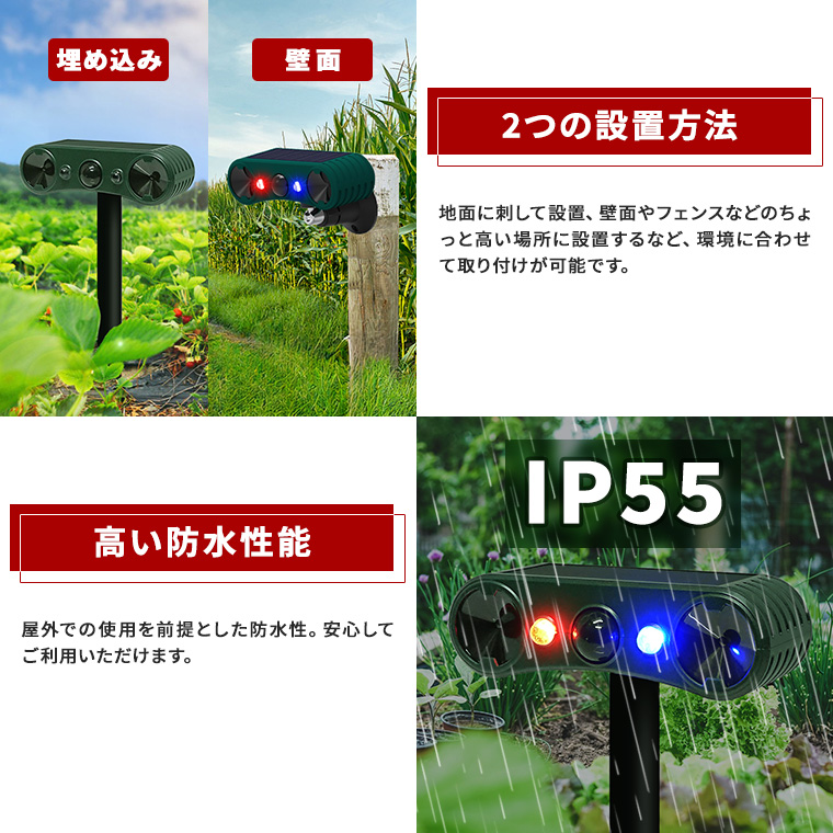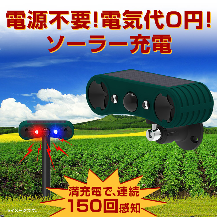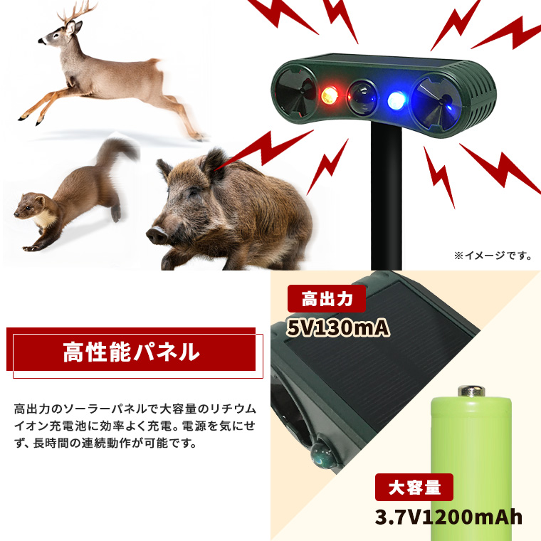 ●超音波・爆音・光、組み合わせて撃退。12〜44KHzの超音波、129dbの強烈な音、点滅の光を組み合わせて動物を威嚇するソーラー赤外線害獣撃退器。音を発しない超音波モードは住宅街でも安心してご利用いただけます。