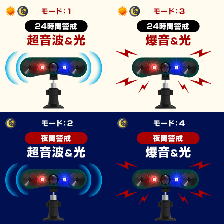 ●4つの撃退モード。超音波&光、爆音&光の撃退方法それぞれに24時間警戒と夜間警戒モードを搭載。利用環境や用途に合わせて切り替え可能です。