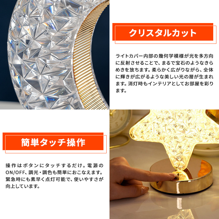 ●クリスタルカットの輝きが特徴のインテリアライト。 電球色、昼光色、白色に切り替えることができ、タッチスイッチで無段階調光が簡単に楽しめます。 リビングや寝室に最適なアクセント照明として活躍します。