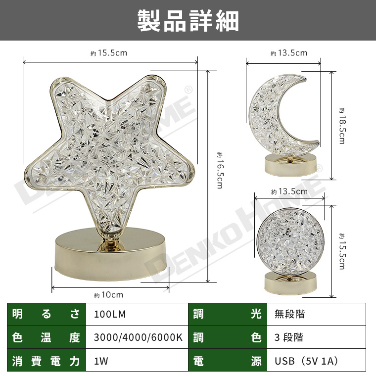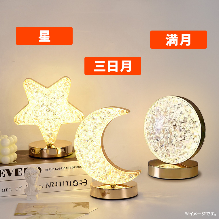 | 商品仕様 | | 品名 | インテリアライト クリスタル (i-light-nl19) | | サイズ(約) | 星:幅15.5×奥行10×高さ16.5cm/三日月:幅13.5×奥行10×高さ18.5cm/満月:幅13.5×奥行10×高さ15.5cm | | LEDカラー | 電球色(3000K)/白色(4000K)/昼光色(6000K) | | 光束(明るさ) | 最大 100ルーメン | | 調光 | 無段階 | | 調色 | 3段階 | | 点灯時間(約) | 4-5時間 ※調光・調色により異なります。 | | 充電時間(約) | 2時間 | | バッテリー | Li-ion 3.7V 1200mAh | | 入力電源 | 5V 1A | | 電源 | USB充電 | | 素材 | ABS | | 制御 | 本体スイッチ | | 商品内容 | ライト本体×1、充電ケーブル×1 | | 関連ワード | インテリア ナイトライト 充電式 コードレス 上品 オシャレ 韓国 雰囲気 間接照明 北欧 | | 関連商品 | >>>インテリアライトはコチラ!