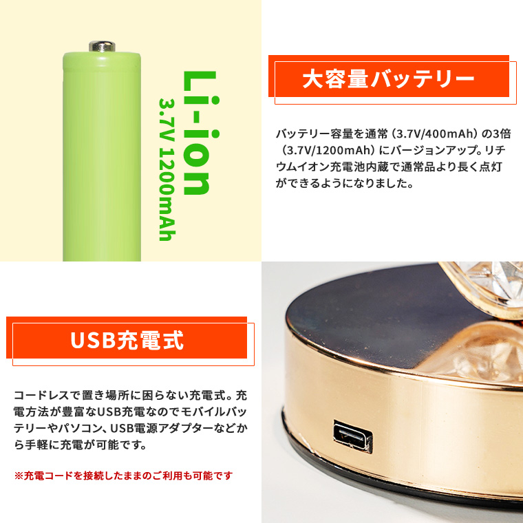 ・大容量バッテリー。バッテリー容量を通常(3.7V/400mAh)の3倍(3.7V/1200mAh)にバージョンアップ。リチウムイオン充電池内蔵で通常品より長く点灯ができるようになりました。