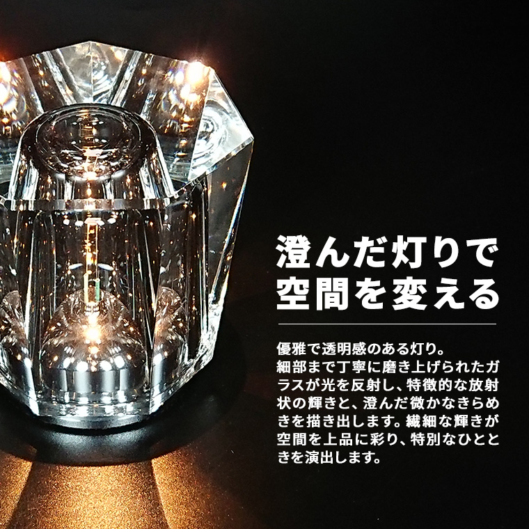 ・上品な透明感。高級感あふれるクリスタルガラスを使用し、上質な輝きと透明感を兼ね備えたインテリアライト。重厚で洗練された佇まいは、置くだけで空間に品格と華やかさを添えます。
