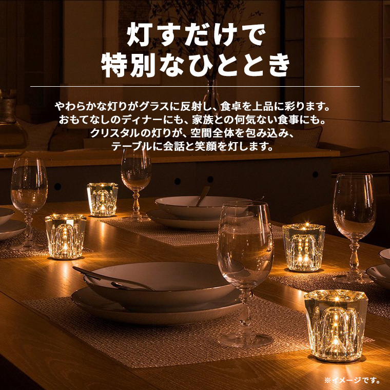 ◆灯すだけで、特別なひととき。やわらかな灯りがグラスに反射し、食卓を上品に彩ります。おもてなしのディナーにも、家族との何気ない食事にも。クリスタルの灯りが、空間全体を包み込み、テーブルに会話と笑顔を灯します。