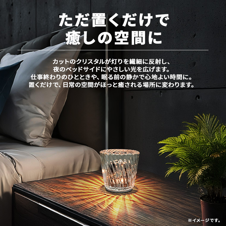 ◆ただ置くだけで、癒しの空間に。カットのクリスタルが灯りを繊細に反射し、夜のベッドサイドにやさしい光を広げます。仕事終わりのひとときや、眠る前の静かで心地よい時間に。置くだけで、日常の空間がほっと癒される場所に変わります。