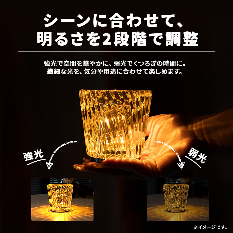 ◆シーンに合わせて、明るさを2段階で調整。強光で空間を華やかに、弱光でくつろぎの時間に。繊細な光を、気分や用途に合わせて楽しめます。