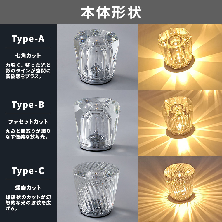 ◆光と影が描く、贅沢な時間。上質なカットが施されたクリスタルガラスが、電球色の光を美しく反射。放射状に広がる光と影の模様が、リビングやダイニング、ベッドルームを華やかに演出します。置くだけで高級感をプラスするLEDライトで、雰囲気づくりや間接照明としても最適。選べる3種類のデザインで、ギフトやプレゼントにもおすすめです。