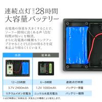 ◆連続点灯28時間(最大)の大容量バッテリー充電池の容量を大きく(2400mAh)することで、ソーラー照明に良くある声「点灯時間が短い」を解消。さらに充電池の種類もランクアップ(18650 リチウムイオン充電池)させることでLEDの明るさを従来品より明るくしています。