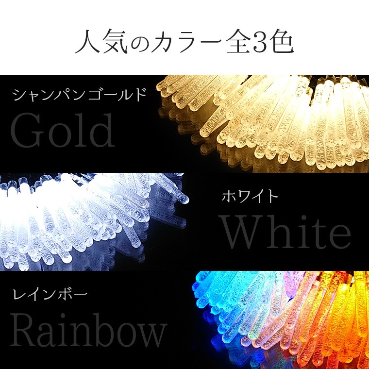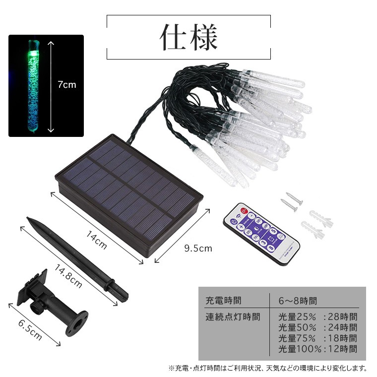 | 商品仕様 | | 品名 | イルミネーション ソーラーライト つらら型 (kgsl-icicle) | | LED球数 | 100球 | | 全長(約) | 17m(ソーラーパネルから電球まで2m + 電飾ケーブル15m) | | 各サイズ(約) | ●ソーラー本体:14cm×9.5cm×2.8cm ●支柱:19cm ●LEDの間隔:15cm | | 重量(約) | 773g | | LEDカラー | シャンパンゴールド、ホワイト、レインボー | | フル点灯時間(約) | 光量25%:28時間、光量50%:24時間、光量75%:18時間、光量100%:12時間 ※時間は目安で、使用環境により異なります。 | | フル充電時間(約) | 6〜8時間 ※環境により充電時間は変わります。 | | 防水等級 | IP65 | | ケーブルカラー | 深緑(ダークグリーン) | | 点灯パターン | 8パターン内蔵 | | ソーラーパネル | 5.5V/300MA | | バッテリー | 18650 リチウムイオン充電池:3.7V/2400mAh | | 連結 | 連結不可 | | 商品内容 | ソーラーイルミネーション(ソーラーパネル含む)本体×1、支柱(アンカー)×2、リモコン×1、壁面取付用ネジ・壁面アンカー×各2 | | 関連ワード | クリスマスツリー ソーラーライト 店舗 装飾 ガーランド 野外 庭 ベランダ 太陽パネル ガーデンライト |