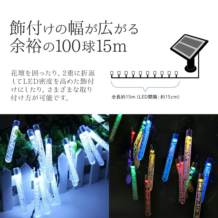 ◆LEDは余裕の100球、長さ15mソケットタイプのイルミには珍しい球数の多さと余裕の長さ。50球や30球タイプと違い、花壇をぐるっと囲ったり、2重に折返してLED密度を高めた飾付けにしたりと、さまざまな取り付け方が可能です。