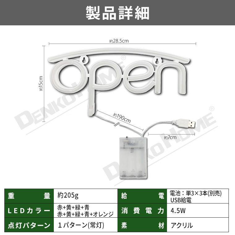 | 商品仕様 | | 品名 | LED ネオンサイン オープン 2way電源(電池/USB) (neonl-bb) | | サイズ(約) | 本体:28.5×15×1.5 / ケーブル長さ 本体〜電池ボックス:約190cm 電池ボックス〜USB端子:約7cm | | 重量(約) | 205g | | 点灯パターン | 1パターン(常灯) | | 電源 | USB給電 / 単3電池×3本(別売) | | LEDカラー | 赤+黄+ピンク+青 / 赤+黄+ピンク+青+オレンジ | | 素材 | アクリル | | 消費電力 | 4.5W | | 商品内容 | 本体×1 | | 関連ワード | ネオンサイン 照明 クリスマスライト インテリアライト デコレーション アメリカン 北欧 かわいい 雑貨 レトロ |