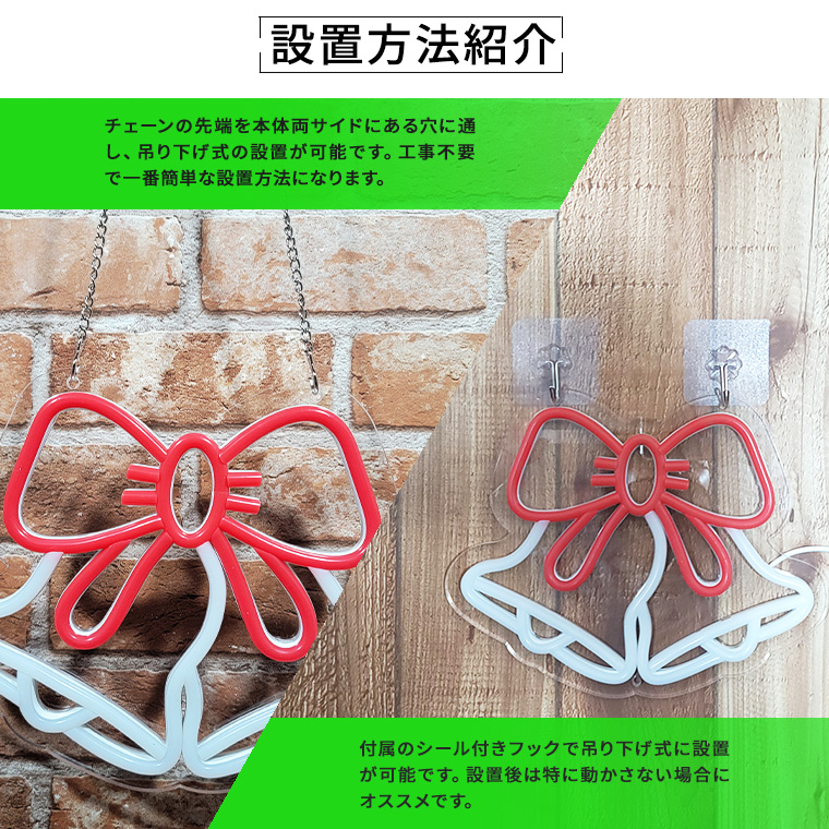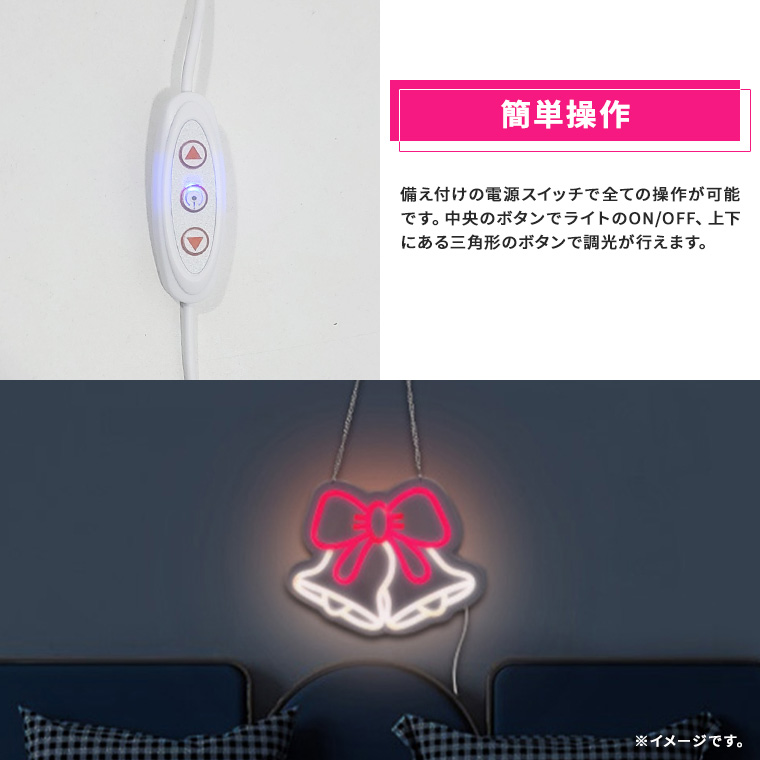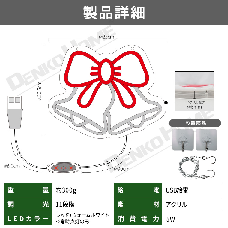 | 商品仕様 | | 品名 | LED ネオンサイン ベル 11段調光 USB式 (neonl-bw) | | サイズ(約) | 本体:25×20.5×1.5cm / ケーブル全長:190cm / アクリル厚さ:0.6cm | | 重量(約) | 300g | | 点灯パターン | 1パターン(常灯) | | 調光 | 11段階 | | 電源 | USB給電 | | LEDカラー | レッド+ウォームホワイト | | 素材 | アクリル | | 消費電力 | 5W | | 商品内容 | 本体×1、フック×2、チェーン×1 | | 関連ワード | ネオンサイン 照明 クリスマスライト インテリアライト デコレーション アメリカン 北欧 かわいい 雑貨 レトロ |