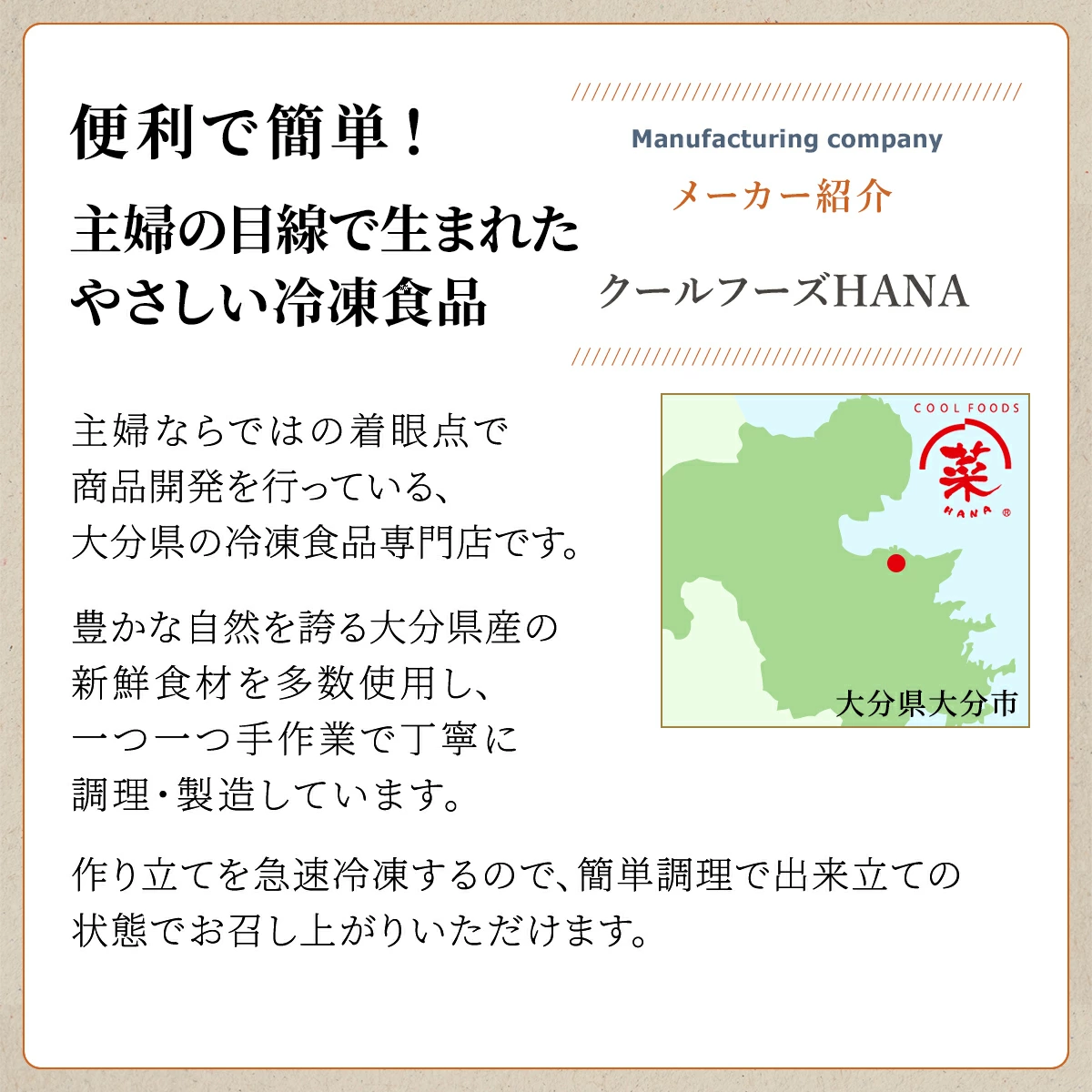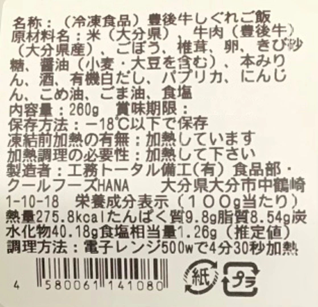 | 製造者 | 工務トータル備工 有限会社 食品部・クールフーズHANA 大分県大分市中鶴崎1丁目10-18 |