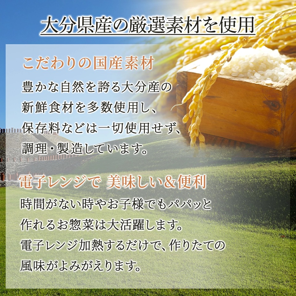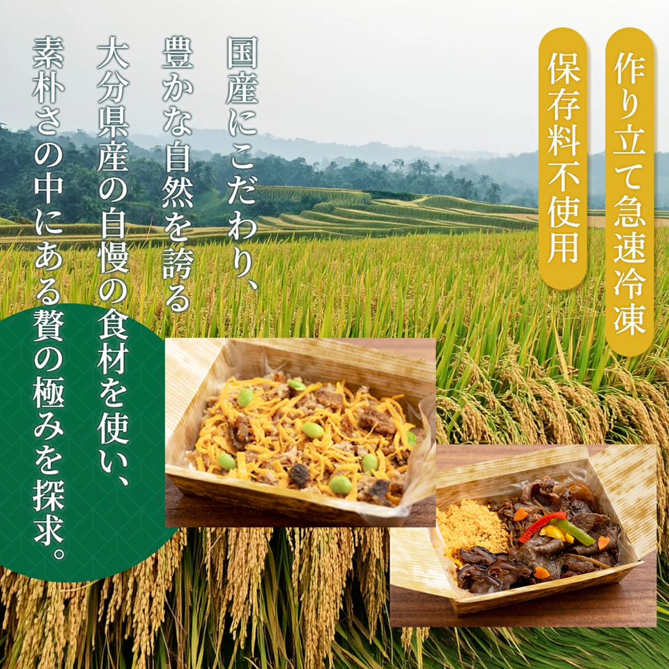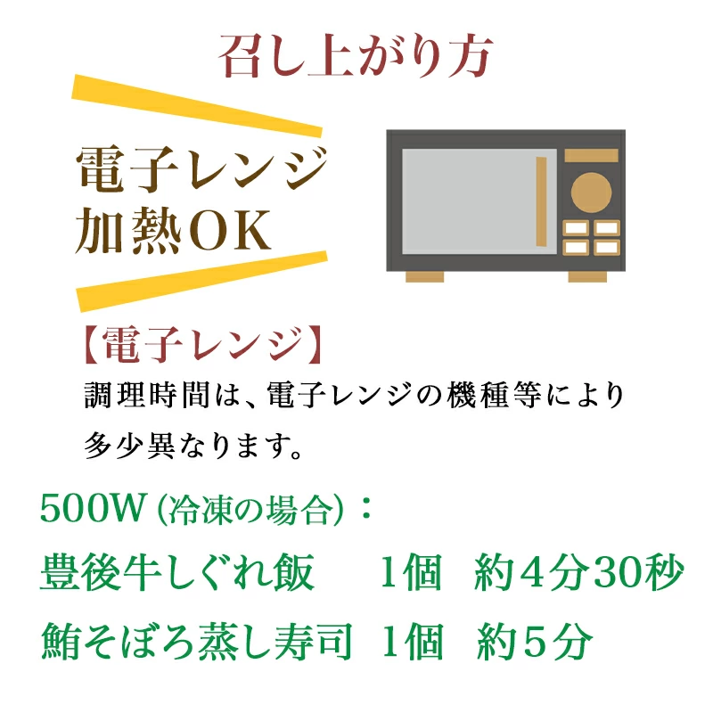 | 召しがり方 | 電子レンジ(500W)で加熱してお召し上がりください。 ・豊後牛しぐれ飯…4分30秒 ・鮪そぼろ蒸し寿司…5分 ※ヤケドにご注意ください。 |