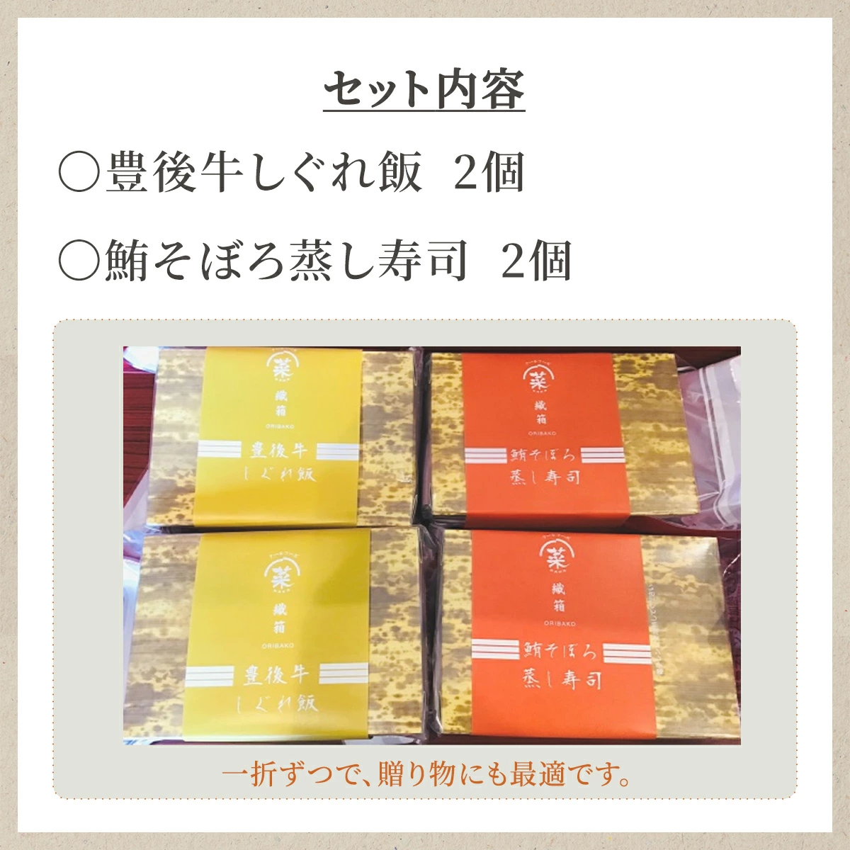 | 内容量 | ・豊後牛しぐれ飯 260g×2個 ・鮪そぼろ蒸し寿司 280g×2個 合計4個 約1080g |