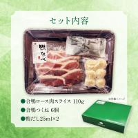 | 内容量 | ・合鴨ロース肉(スライス) 110g ・合鴨入りつくね 6個 ・鴨だし25ml×2 |