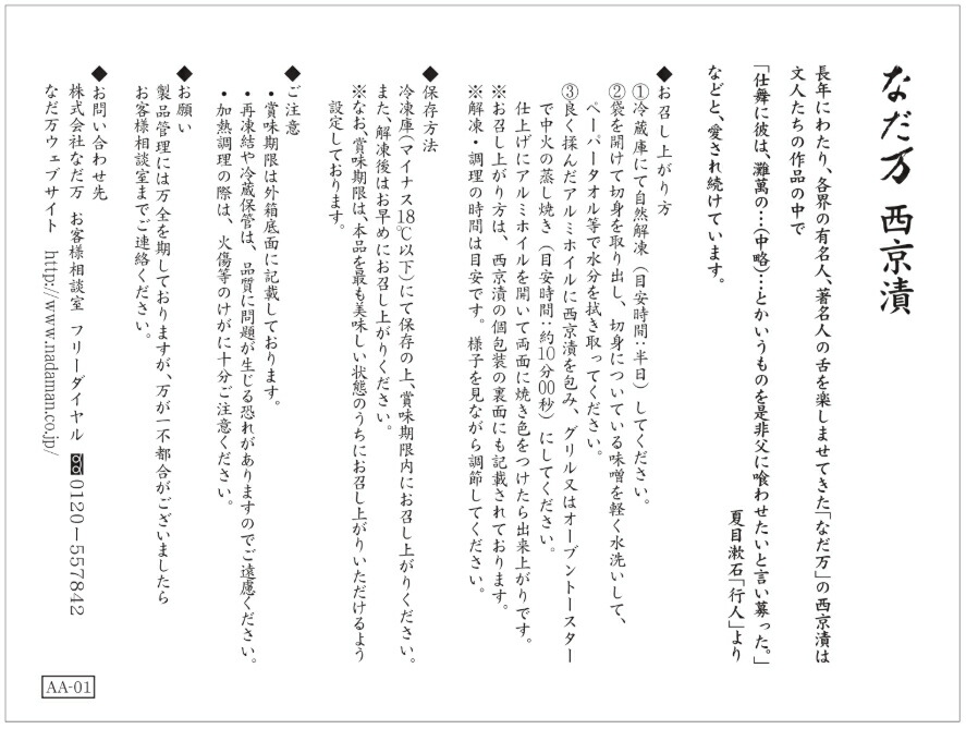 | 召しがり方 | ●西京漬 1.冷蔵庫にて自然解凍(目安時間:半日)してください。 2.袋を開けて切身を取り出し、切身についている味噌を軽く水洗して、ペーパータオル等で水分を拭き取ってください。 3.良く揉んだアルミホイルに西京漬を包み、グリル又はオーブントースターで中火の蒸し焼き(目安時間:約10分)にしてください。 仕上げにアルミホイルを開いて両面に焼き色をつけたら出来上がりです。 ※解凍・調理の時間は目安です。様子を見ながら調整してください。 ※お召し上がり方は商品に同梱しております【しおり】を参照ください。 西京漬「しおり」 ※解凍後は冷蔵庫で保管の上、早めにお召しあがりください。 |