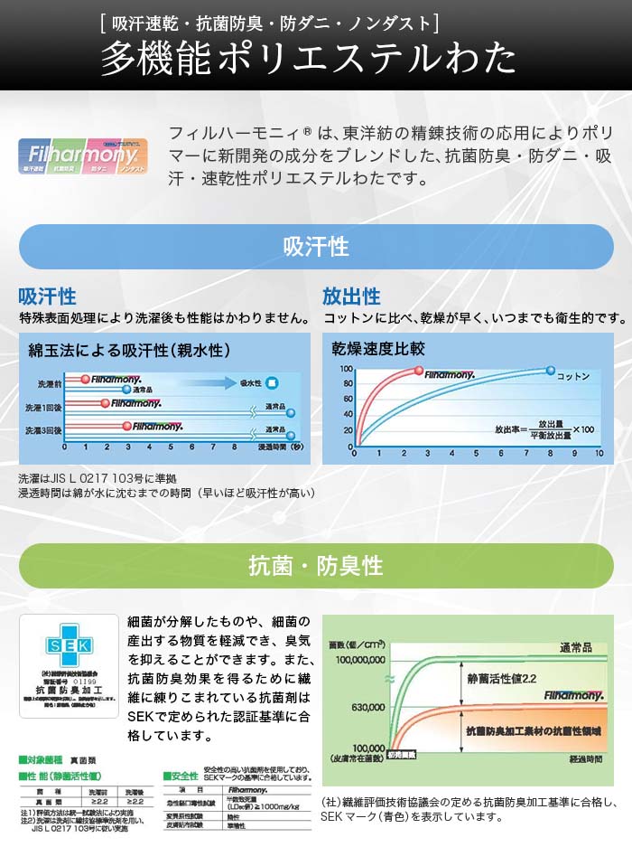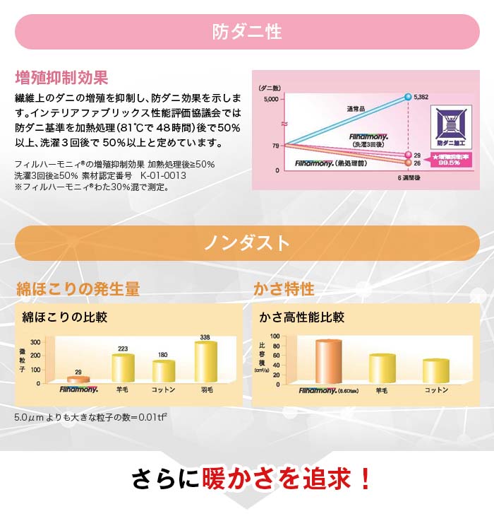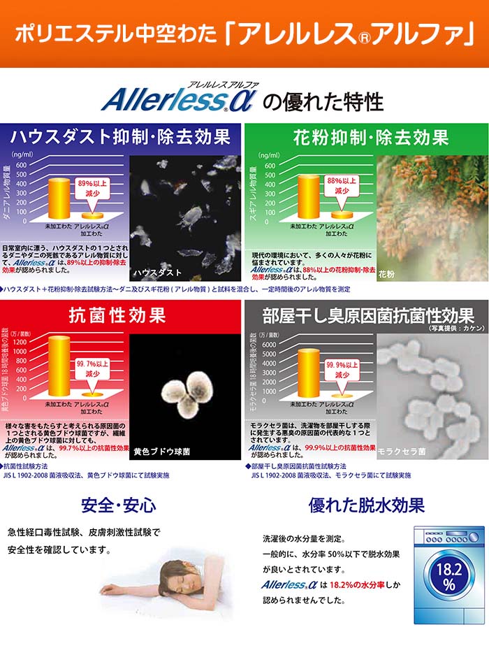さらに中綿に抗菌・消臭・防ダニ・吸汗・速乾素材の「フィルハーモニィ®」と、アレル物質抑制&抗菌効果を備えた機能素材「アレルレス®アルファ」を追加。ダニの糞や死骸、花粉などのアレル物質を抑制します。さらに側地には薬剤不使用で、24時間テストでダニを1匹も通さなかった高密度生地を使用。「暖かい」「軽い」「清潔」と、快適さ満載の日本直販オリジナル仕様モデル(日本製)をお買得価格でこの機会に是非!