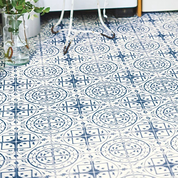 オシャレなクッションフロア 昭和レトロ 古民家 飲食店 ヴィンテージ マヨリカ 大正ロマン イタリア ビンテージ カジュアル サロン 癒し 市松 石 青 紺色 ポップ 美容室 インスタ映え 綺麗な色 清潔 市松